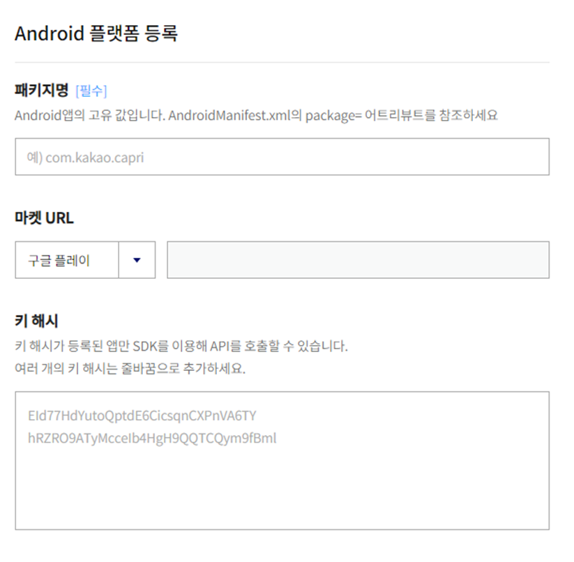 이렇게 해시 값을 얻고 내 애플리케이션 android 플랫폼 등록의 키 해쉬 부분에 입력한다.